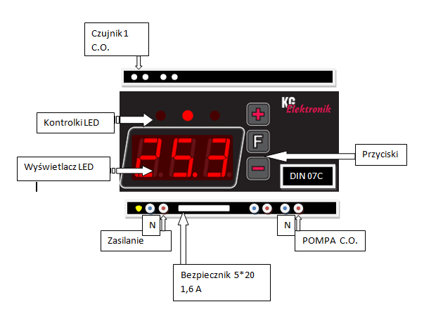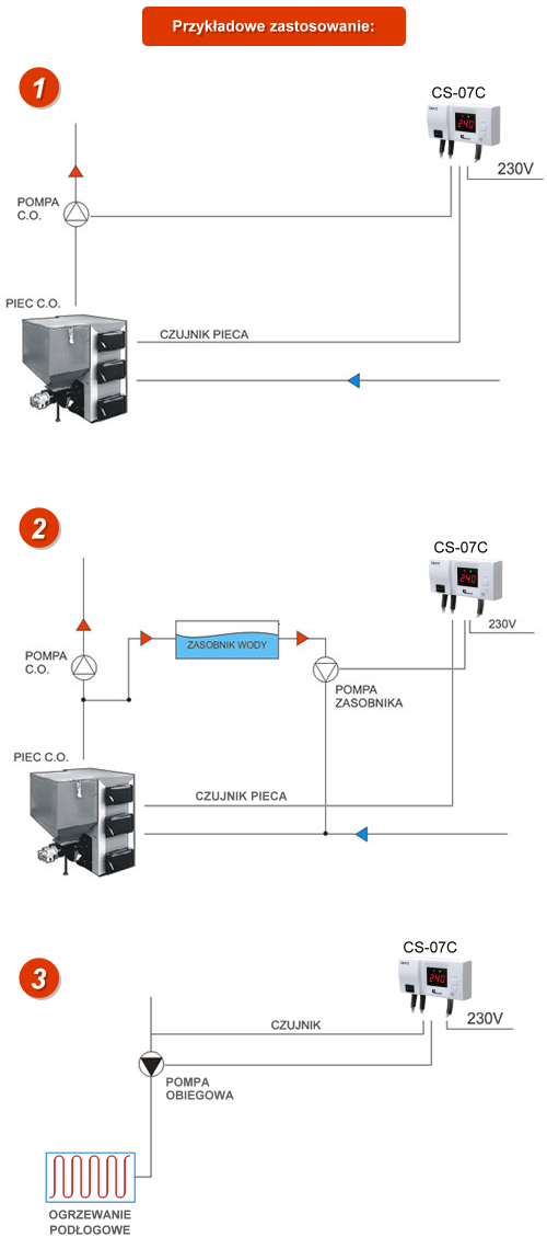 Sterownik CS-07C może być zastosowany jako termostat lub sterownik pompy podłogowej. W urządzeniu mamy możliwość regulowania temperatury załączenia jak i wyłączenia pompy. Pompa załącza się po przekroczeniu ustawionej przez użytkownika temperatury załączenia (O) wyłączy po przekroczeniu ustawionej temperatury wyłączenia (U).