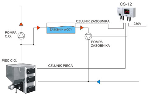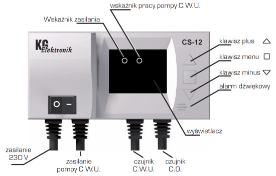 Sterownik CS-12 jest przeznaczony do sterowania pompą C.W.U. Pompa C.W.U. działa na zasadzie różnicy temperatur. Załączenie pompy C.W.U. następuje w momencie, gdy temperatura kotła przekroczy temperaturę zasobnika o ustawioną przez użytkownika histerezę. Pompa C.W.U. pracuje do chwili, gdy temperatury kotła i zasobnika wyrównają się lub ustawiona temperatura zasobnika zostanie osiągnięta.