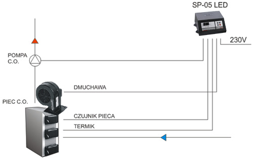 Sterownik SP-05 NEW LED steruje pompą C.O. oraz wentylatorem nadmuchowym. Przeznaczony jest do sterowania kotłami na paliwo stałe. drewno, węgiel, miał. Użytkownik ma do wyboru 5 wersji trybów pracy sterownika uwarunkowanych rodzajem opału oraz typem kotła. Pierwszą czynność jaką musi wykonać użytkownik przed rozpoczęciem eksploatacji sterownika jest ustawienie temperatury pieca, jaką ma utrzymywać sterownik podczas pracy kotła oraz wybrać tryb pracy sterownika w menu.