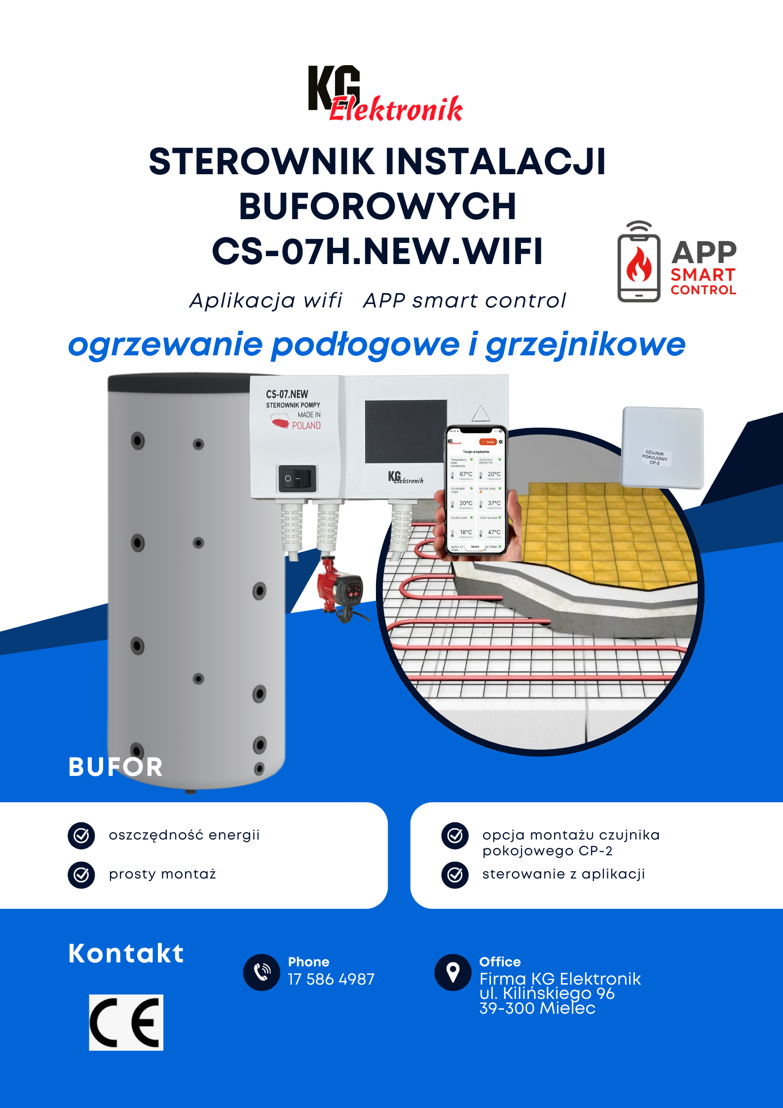 Sterownik CS-07H.NEW może być zastosowany jak termostat lub sterownik Pompy obiegowej w układzie bufor - podłogówka lub grzejniki lub innej konfiguracji według preferencji klienta. W Urządzeniu mamy możliwość regulowania temperatury załączenia jak i wyłączenia pompy. Pompa załącza się po przekroczeniu ustawionej przez użytkownika temperatury załączenia „C” a wyłączy po przekroczeniu temperatury „U” Pomiar temperatury jest brany z dwóch czujników oddzielnie dla załączenia i wyłączenia pompy.