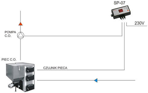 Sterownik typu SP-07 przeznaczony jest do sterowania pompą obiegu wody c.o. Wyposażony jest w funkcje anty-stop i alarm dzwiękowy. Zadaniem regulatora jest załączenie pompy jeśli temperatura przekroczy dana wartość, oraz wyłączenie jej, jeśli piec wychłodzi sie (na skutek wygaszenia). Zapobiega to niepotrzebnemu działaniu pompy, co pozwala zaoszczędzić energię elektryczną (oszczędności, w zależności od stopnia wykorzystania pieca nawet do 60%), jak i przdłuża żywotność pompy. Dzięki temu wzrasta jej niezawodność i maleją koszty związane z eksploatacją.