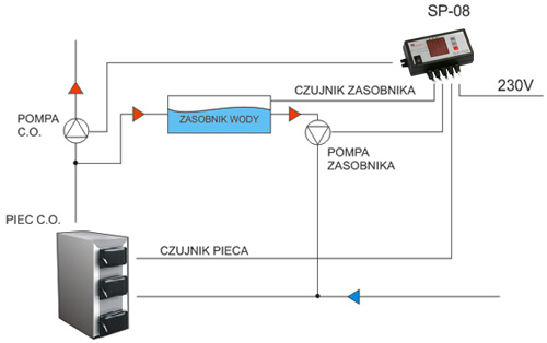 Sterownik ten przeznaczony jest do sterowania pompą obiegu wody c.o. i c.w.u. Zadaniem sterownika jest załączenie pompy jeśli temperatura przekroczy żądaną wartość, oraz wyłączenie jej jeśli piec wychłodzi sie na skutek wygaszenia. Przy wyłaczonym piorytecie, pompy zastają załączane razem, następnie pompa c.w.u. zostaje wyłaczona przy nastawionej temperaturze zasobnika. Przy włączonym piorytecie pierwsza pracuje pompa c.w.u., dopiero jak zasobnik osiągnie nastawioną temperaturę, załączy sie pompa c.o. Pompa c.w.u. przestaje pracować. Posiada funkcje anty-stop, ktora zapobiega zastaniu sie pompy w okresie letnim. Sterownik ten posiada wbudowany podwójny wyświetlacz typu LED. Możliwość włączenia / wyłączenia piorytetu pompy c.w.u.